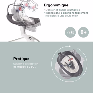 - La balancelle électrique Swoon Motion de Babymoov a un dossier (2 positions) et une assise (3 positions) réglables indépendamment à une main