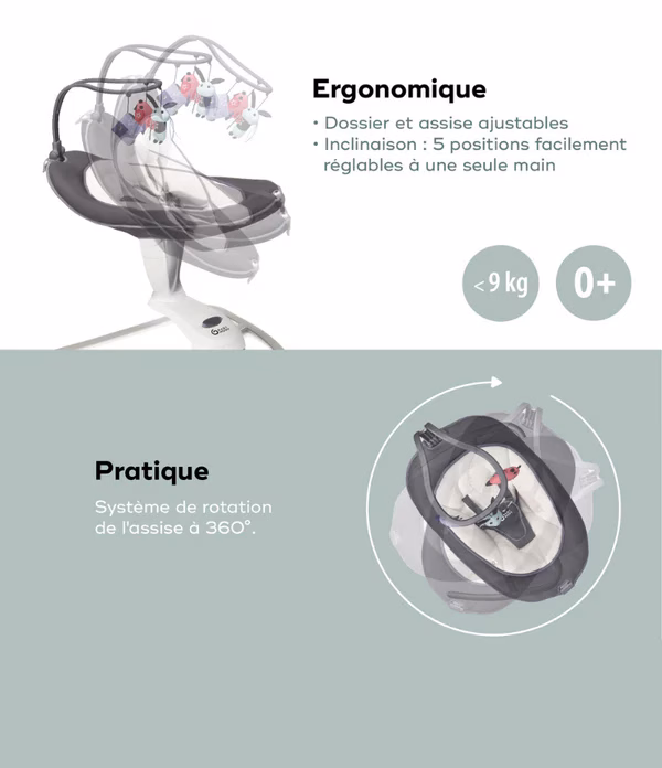 - La balancelle électrique Swoon Motion Zinc Babymoov a 2 modes de bercement : latéral ou d’avant en arrière