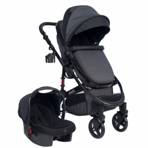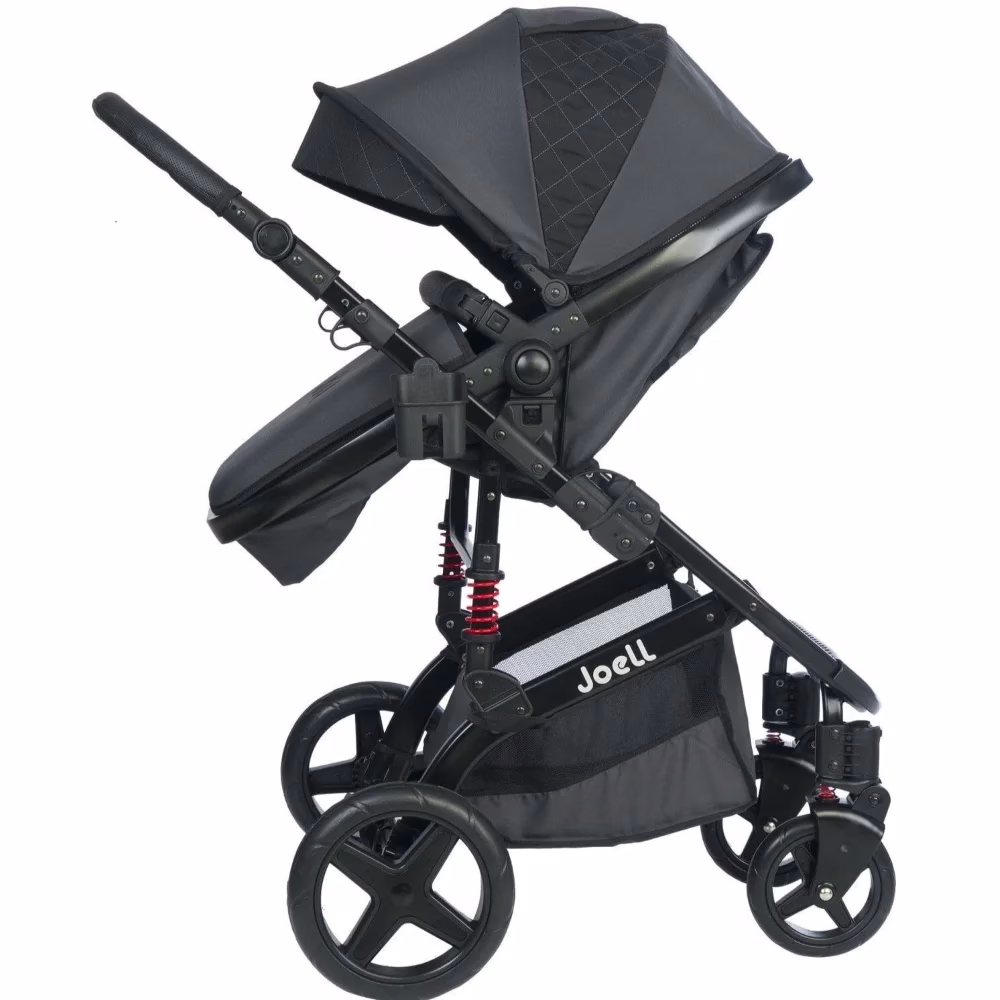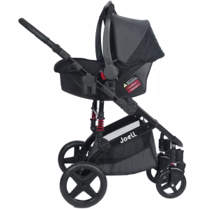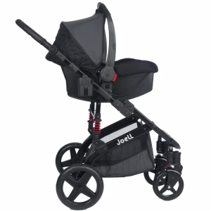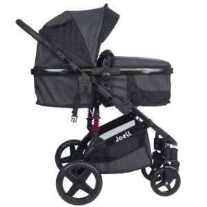 Poussette avec maxicosy noir gris Joell est une poussette pour bébé évolutive, utilisable dès la naissance du bébé vu que le siège poussette se transforme en nacelle avec position allongée plate, jusqu’à l’âge de 4 ans.