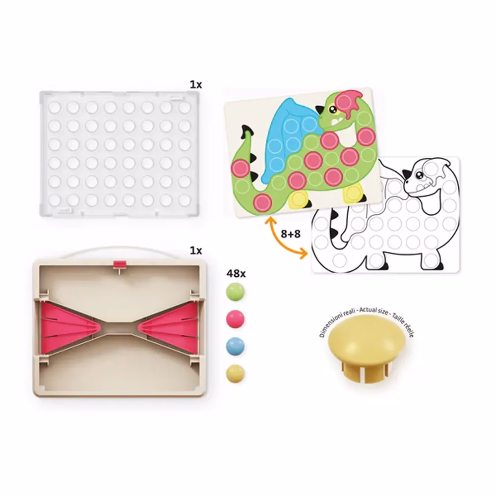 Les enfants peuvent suivre les 8 cartes illustrées incluses pour reproduire des motifs amusants ou laisser libre cours à leur imagination pour créer leurs propres mosaïques colorées. La grille perforée transparente facilite l’assemblage et permet de visualiser les créations de manière claire et ludique.