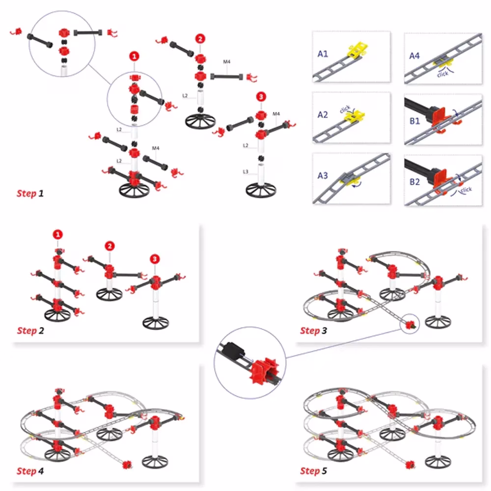 Grâce à ce kit, les jeunes joueurs peuvent manipuler différentes billess et matériaux pour expérimenter et observer les principes fondamentaux de la physique tels que la gravité, la vitesse, la force et la centrifugation. Chaque parcours offre une expérience unique et interactive, encourageant les enfants à planifier, construire et tester leurs créations.
